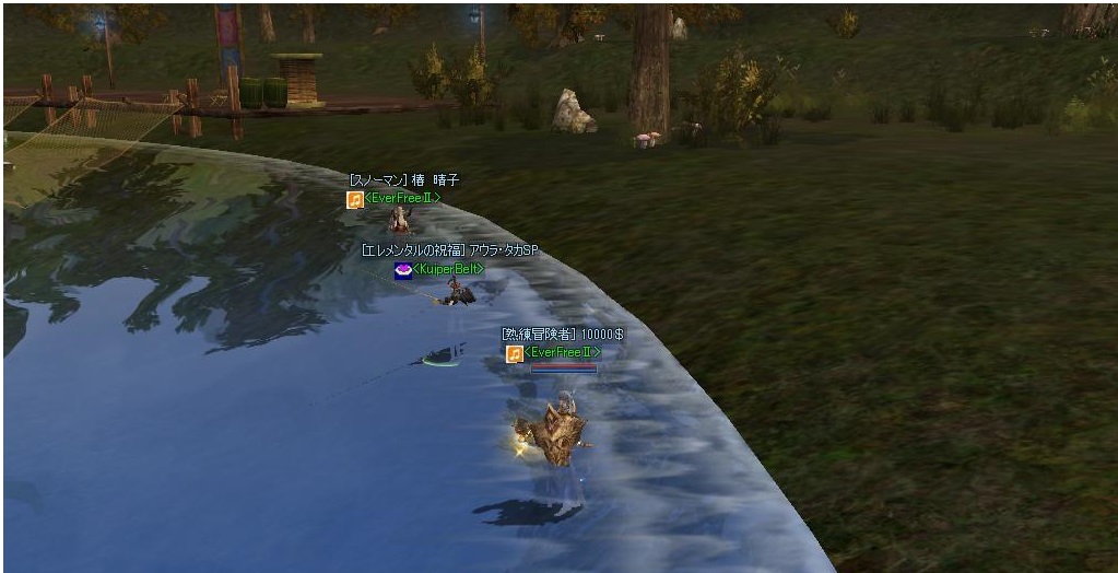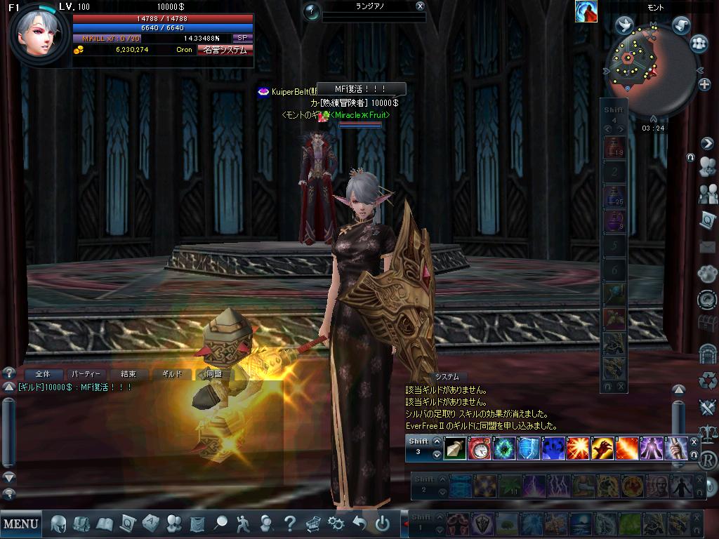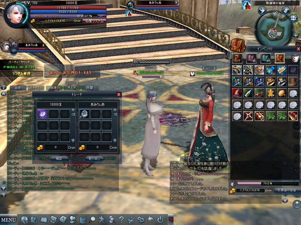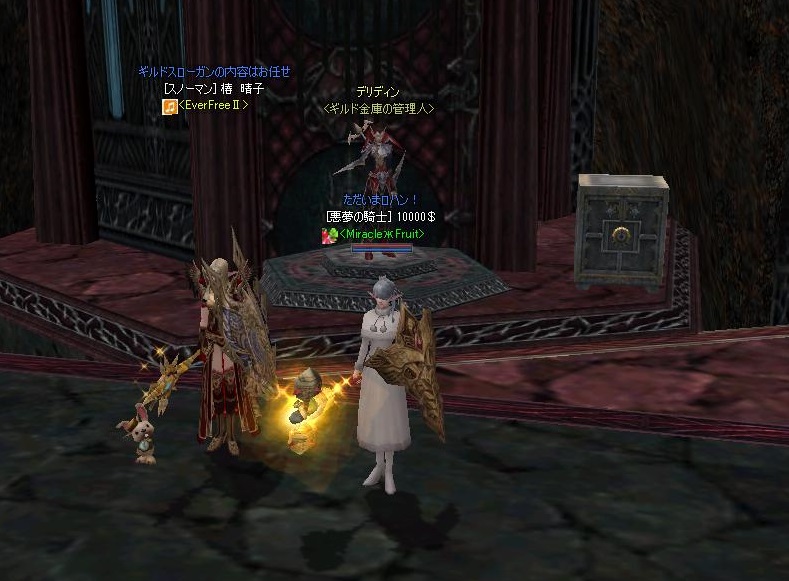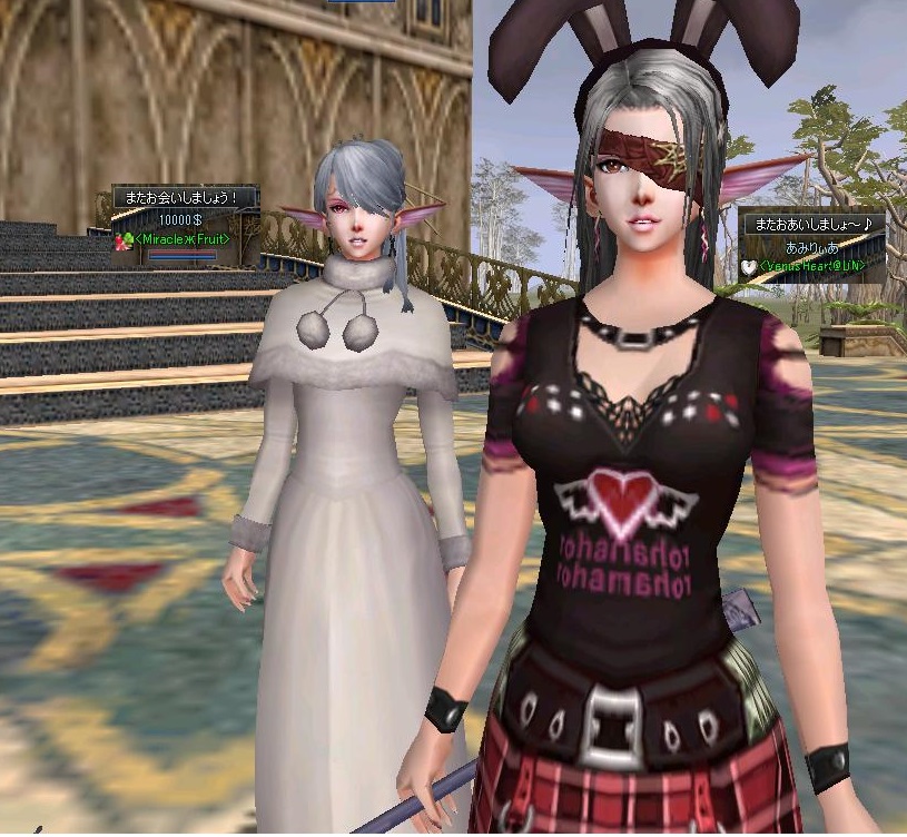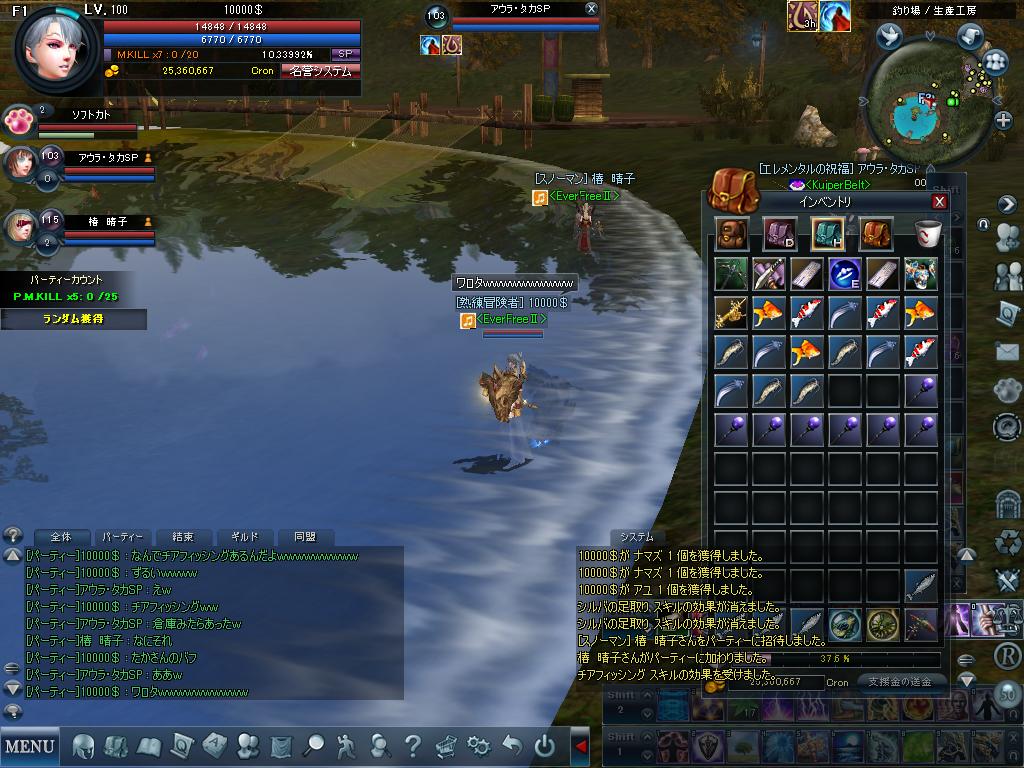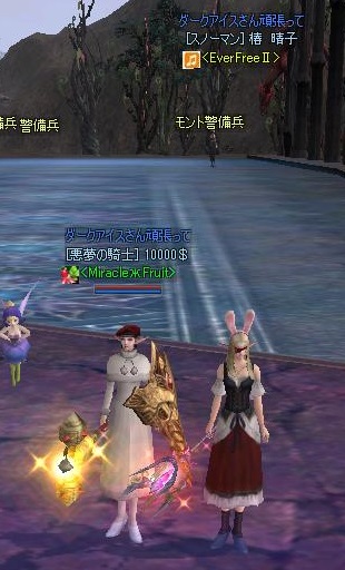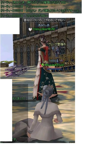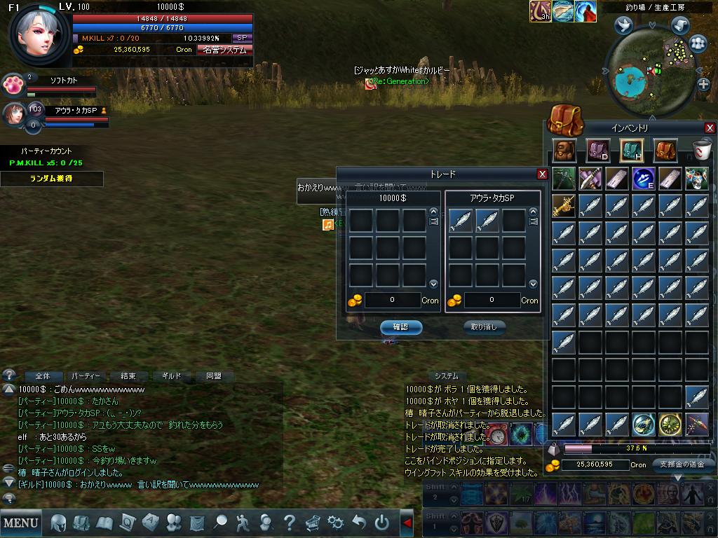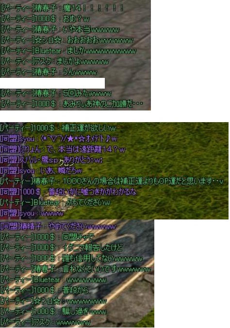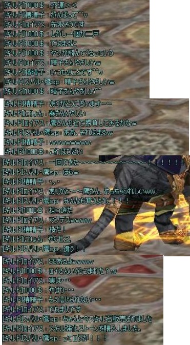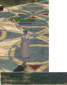 この記事は、MiracleжFruitのメンバーだった方はもちろん、私を知る方、あるいはこのブログに来た事がある方には特に懐かしんでいただけるような内容にしたいです。 どうか、そのような方々がこの記事にたどり着くことができますように。という願いを込めて、本編に入りたいと思います。 MiracleжFruitとしてのエンディング条件 Ever FreeⅡのギルド金庫にボスアクセを納めるツアー の道中で得た武器防具をエサにアユを釣り、ボスから出たスキル石と合わせてギルドを作成。ギルド名をMiracleжFruit(ミラクルフルーツ)とし、エバフリ2と同盟。タウンにも登録してギルドスローガンで何かを残す事。 元連合1サーバーの皆様覚えておいででしょうか? あるいは2010年のサーバー統合以前に連合2サーバー、シルバサーバーだった方、それ以降にロハンを始めた方はお初にお目にかかります。 あのまぞーーーいギルマスクエを再び消化した上で、私がギルマスを務めていたお騒がせギルド MiracleжFruit が復活しました。・・・え?古くから連合1にいるけど、そんなギルド知らないって?・・・・すぐに消えちゃいましたからwwwwwwww という事で、ギルド作成が完了しています。 まずはその辺りのいきさつからご紹介しましょう。 条件の都合上、ボスアクセ獲得ツアーでスキル石と釣り餌が集まった後でなければ、ギルド作成は進められないので、ギルマス予定の10000$はEver FreeⅡに所属して晴子と活動した。 いつものようにモントギルド金庫前にいると、晴子が「たかさんいるよ」と言う。 たかさんといえば、EFメンバー→フェニ(GM)→MFメンバーであり、私や晴子と同じギルドの出身になる。(まあ、ほんの少ししかEFにいなかった私がEF出身というと、ちょっと違和感有りかもしれない) 私個人との付き合いにおいては、互いのファーストキャラの3F時代くらいからのフレンドという仲。そういえば、スカウトだった私はとにかくクイックネスが7の人にフレンドを申し込みまくっていたバフ乞食でしたwwwww ~~~ちなみに私のキャラクター育成は~~~ 2006~7年 → 2009年 → 2010年 メダル(91)→100$(95)→1000$(99)→10000$(99)・・・というような順序だったかな。大まかにですが。 ~~~~~~~~~~~~~~~~~~~~~ ここからはSSで。 3人で釣りを始めるわけなんですが・・・ たかさんが言っているのは見つからなかった釣り竿があったという話。で、チアフィッシングは向こうのギルマスが気を利かせていれたくれたみたいですが、晴子もすぐ入れてくれました。まあ体感微妙なんですがw それとは別の問題で、このSSで私が重大なミスをしているのが晒されている事はお気づきでしょうか? この後、私は「もう晴子が持っているやつ(ボスアクセ)使おうか。」と、超絶紛らわしい発言をします。アユを釣っているんだから、この場合でボスアクセと受け取ってもらえるわけはないでしょう。それを聞いた晴子は即座にサブのアユを取りに行きます。 このSSの真ん中くらいで、アユはいいのよwwwwって言ってますが、そういう意味です。しかし一歩遅くて間に合いませんでした。アユを渡してくる晴子に、ギルチャで言おうとした事を言わなかった。 これが私のミスその2です。 で、アユをトレードできる数いっぱいに埋めて渡してくる晴子なんですが・・・釣り餌を買いすぎてインベントリがいっぱいだったので、確定した瞬間トレードが取り消されてしまいます。 なので、バインドで魚を捨てたんですが、どうやら誰かが猿かフェアリーを出していたようで、何匹か吸い込まれました。LV1の魚なので、そういう意味での痛手はないですが、マナーの問題でミスその3というところです。 とりあえず端っこに移動して魚とか餌のアカデミーワンドを捨てていると、すかさず突っ込みが入ります。 ここで解説(言い訳)を入れますが、私が言っている「なかったんだもん」は「(持って)なかった」という意味です。もはや通じる状況ではありませんがwww トレードでアユを渡し終えた晴子が戻ってきます。 このSSでわかるように、タカさんからアユを提供してもらいました。 この後、タカさんからブログの完結作業を手伝いますという旨の郵便をもらいますが、実はこうして最終回に登場しただけで、手伝っていただいた。という風に思っています。その上キーアイテムのアユまでいただいたのですから、それで充分です。ありがとうございました。 それにしても・・・裏でこんな苦しいやりとりをしていたんですよ?wwwww せっかくなので、タカさんのハイライトというか、私が選ぶ名シーンを引っ張ってこようかなw ・・・・これかな! ギルメンロイアスさんが、スキル石をはめようと5連敗した流れからの話。 どちらかというと、クールなプレイスタイルでしたし、対人とかロハンの仕様系の会話が多かったイメージのあるタカさんでしたが、バラエティーも心得ていたのをちゃんと拾えていましたww で、問題はこっちですよwwww (なぜ釣り餌を買って釣っていたのか)言い訳しようにも話が長くなるし、タ
